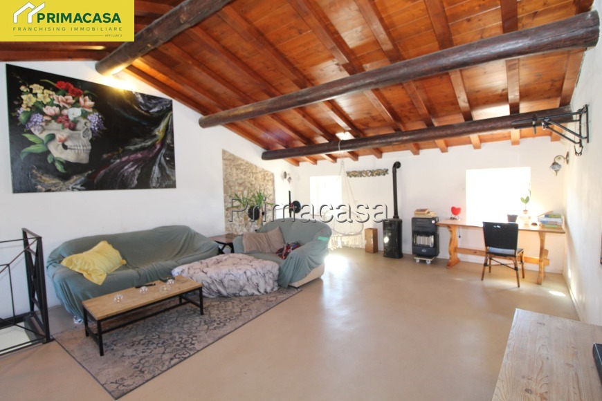 L’ingresso conduce al soggiorno con camino, ideale per momenti di relax, affiancato da una cucina abitabile funzionale. A disposizione del piano un bagno di servizio.