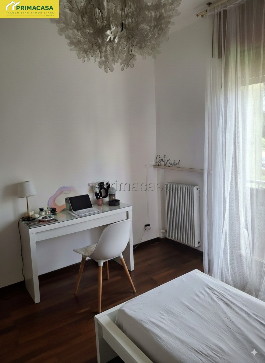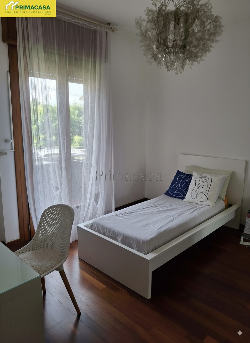 L'appartamento dispone di una camera da letto matrimoniale ampia e confortevole, con letto e comodini in legno, e una scrivania per un angolo studio. Non manca una cameretta singola, perfetta per un bambino o come ulteriore spazio ufficio, dotata di letto singolo e scrivania. Entrambe le camere hanno accesso a finestre che garantiscono una buona illuminazione naturale.