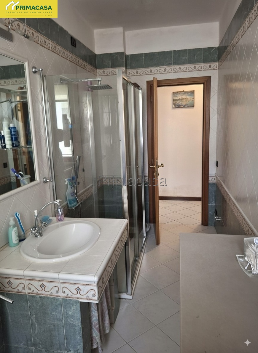Il bagno, moderno e funzionale, è dotato di un ampio lavabo, WC e una comoda doccia, con rivestimenti in piastrelle che creano un ambiente fresco e pulito.