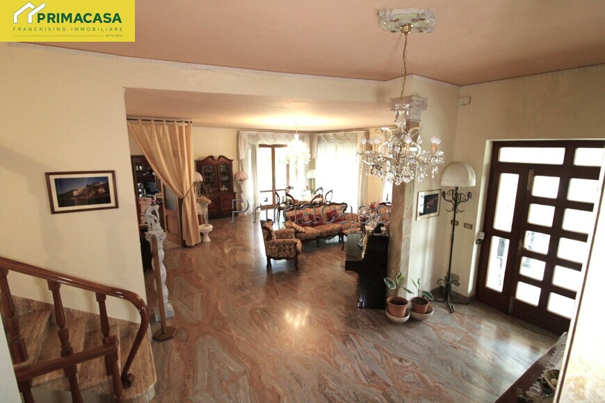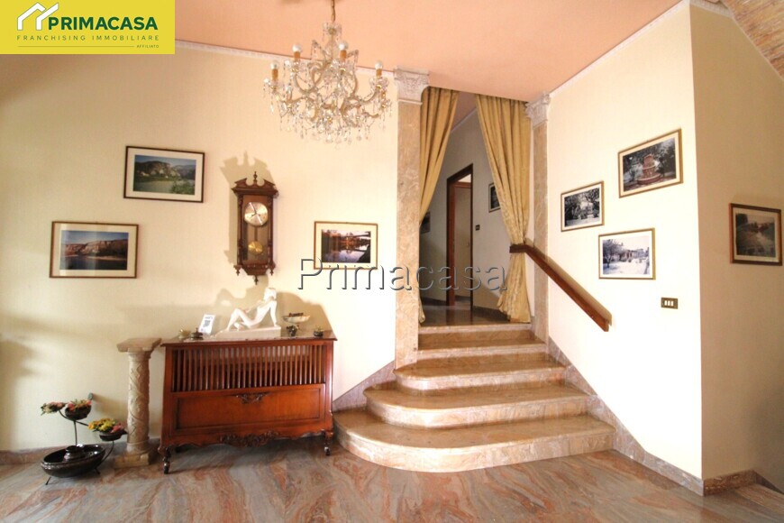 L’ingresso conduce a un ampio salone di rappresentanza, estremamente luminoso, caratterizzato da un importante camino in marmo rosa del Portogallo e da una pavimentazione in marmo arabescato orobico.