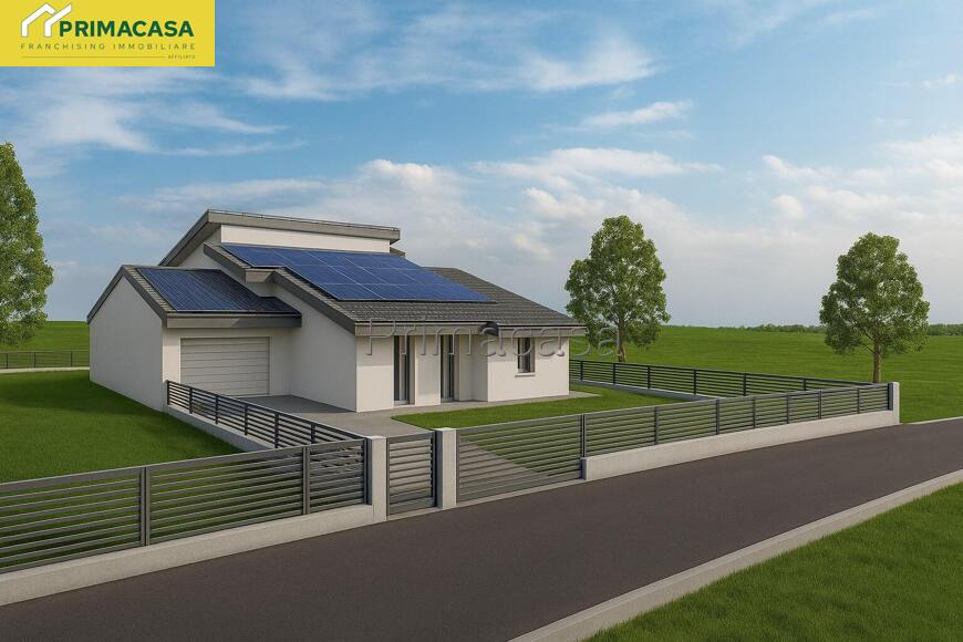 NUOVO: in zona residenziale a pochi passi dal centro paese, su lotto di 550 mq circa, villa singola in classe A4 disposta su un unico livello, con giardino privato di 350 mq circa, composta da soggiorno con cucina a vista (52 mq circa), 4 camere da letto, 2 bagni finestrati e lavanderia. Garage doppio in lunghezza al piano terra. Impianto fotovoltaico da 6 kW, riscaldamento a pavimento in pompa di calore e travi a vista. Possibilità di personalizzare le finiture. Rif. 2836