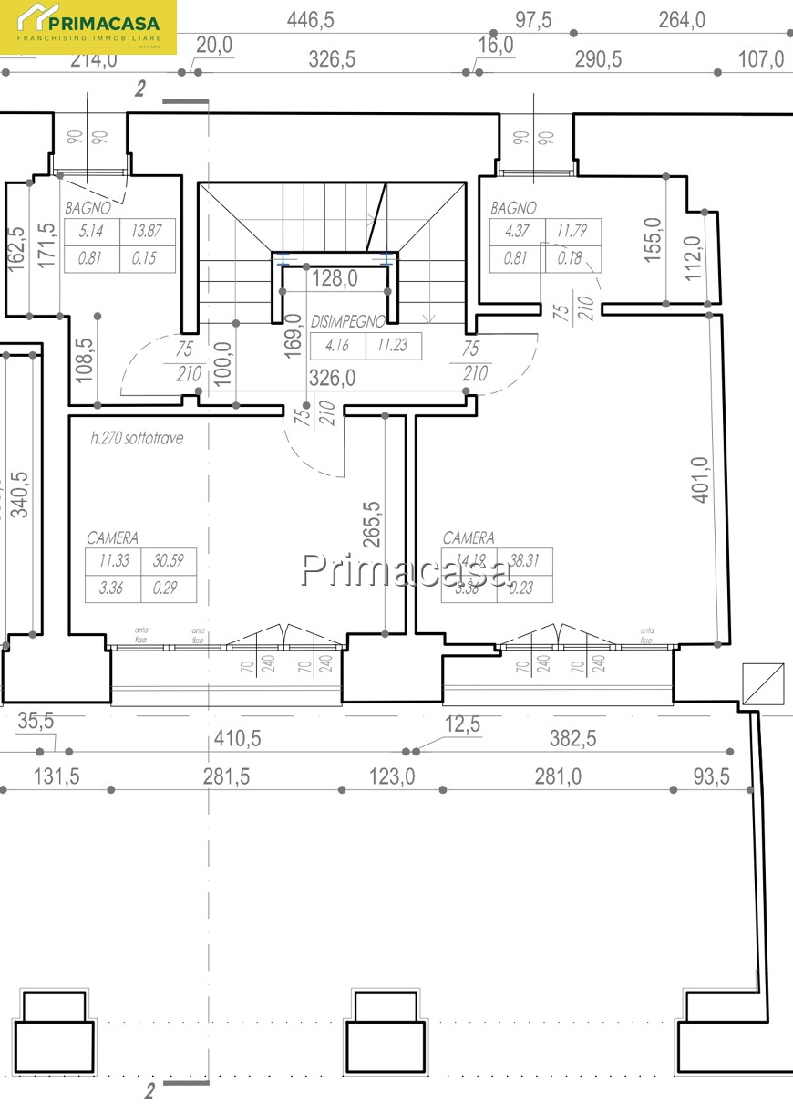 • Primo piano: due camere da letto (di cui una matrimoniale), 2 bagni finestrati (di cui uno privato nella camera matrimoniale)