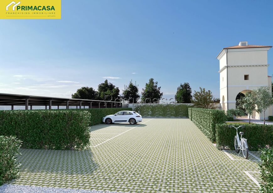 Dal vialetto interno del residence, tra i giardini curati, si attraversa un viale alberato che conduce alla storica torre colombara, elemento distintivo del complesso. L’accesso carrabile, invece, porta direttamente ai posti auto e ai locali accessori di proprietà.