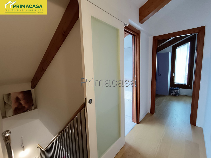 Proponiamo in vendita, in posizione centrale a Peseggia, un elegante ed ampio appartamento disposto su due livelli, situato al secondo piano di un contesto condominiale recente e ben curato. L’abitazione si apre su una luminosa e spaziosa zona giorno, ideale per la vita quotidiana e per accogliere gli ospiti, servita da due comode terrazze che garantiscono spazio esterno ed ottima vivibilità. Al piano principale troviamo inoltre un bagno servito da un terrazzo ed un pratico disimpegno. Salendo al piano superiore, caratterizzato da travi a vista che donano calore e pregio agli ambienti, si sviluppa la zona notte composta da due confortevoli camere da letto finestrate ed un secondo bagno. A completare la proprietà, un ampio garage doppio al piano terra, all’interno del quale è stato ricavato un funzionale angolo lavanderia. Soluzione ideale per chi cerca comfort, spazi ben distribuiti ed una posizione comoda ai principali servizi. RIF 20