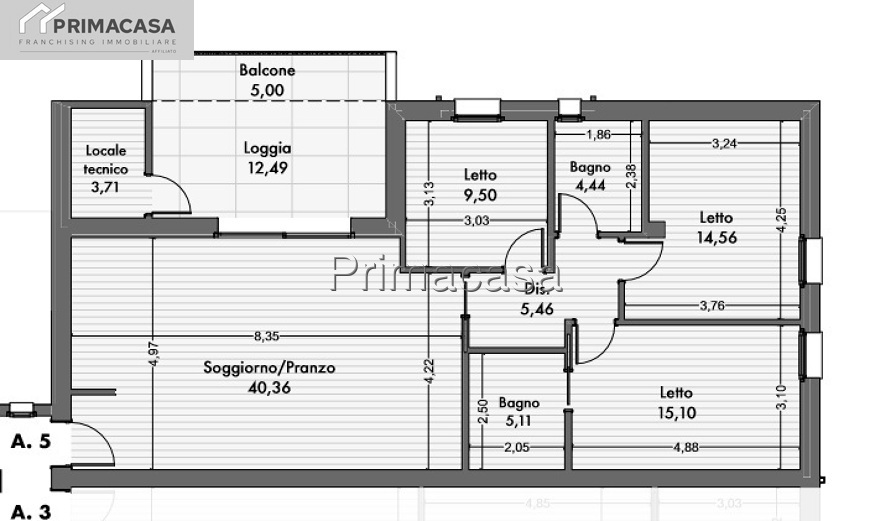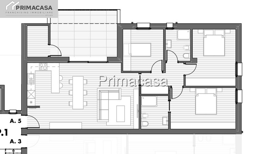 Appartamento al PRIMO piano composto da: ingresso su soggiorno con angolo cottura di circa 40,00 mq, disimpegno zona notte, tre camere da letto, doppi servizi (di cui uno in camera), una loggia con balcone di circa 15,00 mq.