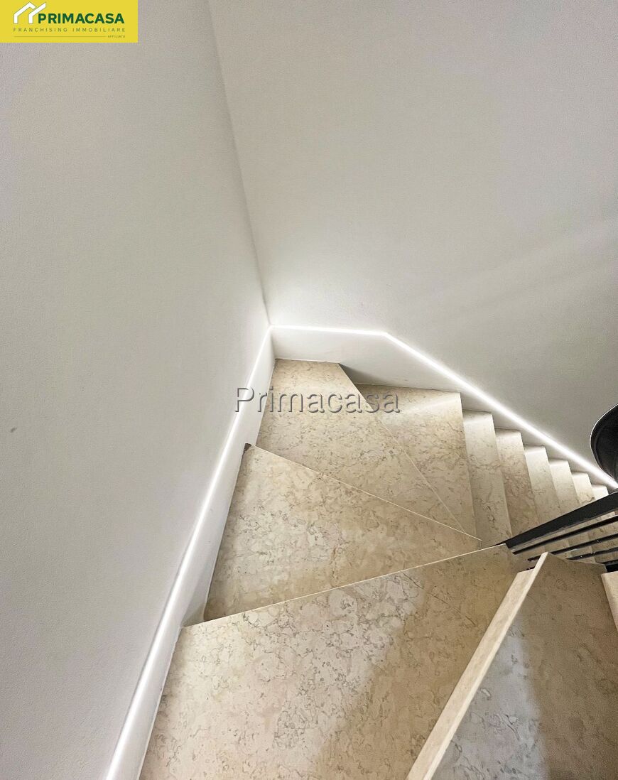 Gli interventi hanno interessato ogni dettaglio: infissi in PVC con doppia vetro camera, bagno nuovo, pavimentazione in grès porcellanato effetto legno nella mansarda, grès effetto pietra sulla terrazza, illuminazione a LED sulle scale e le porte a battente.