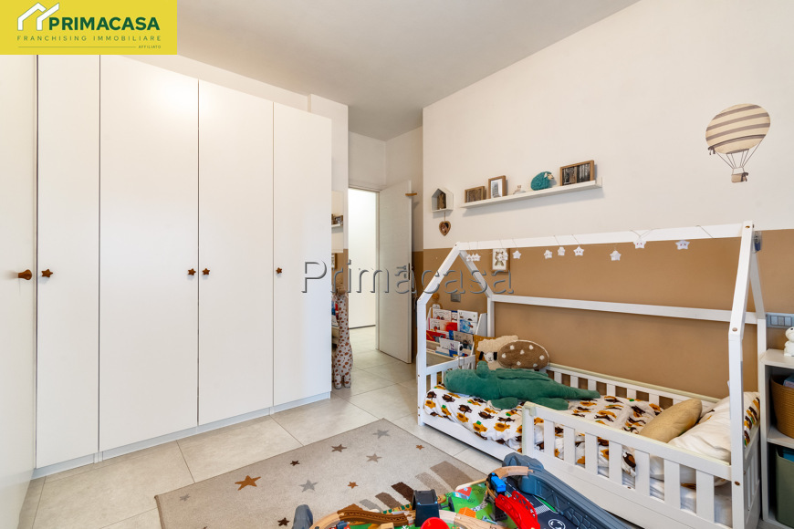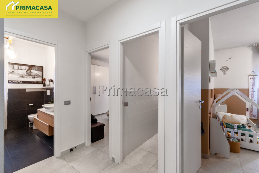 La zona giorno è cosi composta: da disimpegno si accede alle camere, di cui una matrimoniale ampia, una camera 3/4, un primo bagno con pregevole doccia walk in, e secondo bagno attrezzato anche a lavanderia, ulteriore utilissimo armadio a nicchia ideato su misura.