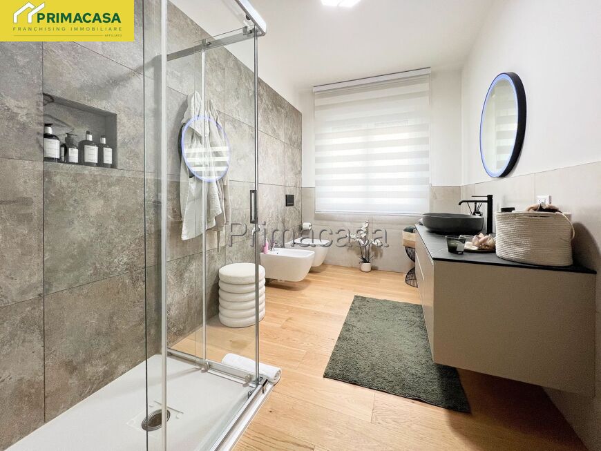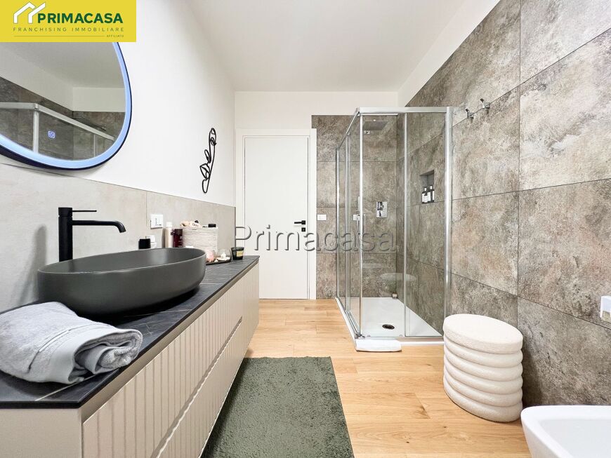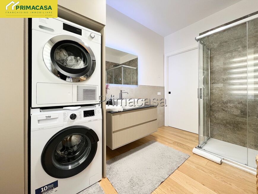 Sempre dalla zona living si accede a un primo bagno finestrato con doccia, completo di sanitari sospesi, attacchi per lavatrice e asciugatrice in colonna e caldaia a condensazione elegantemente integrata in un mobile su misura.