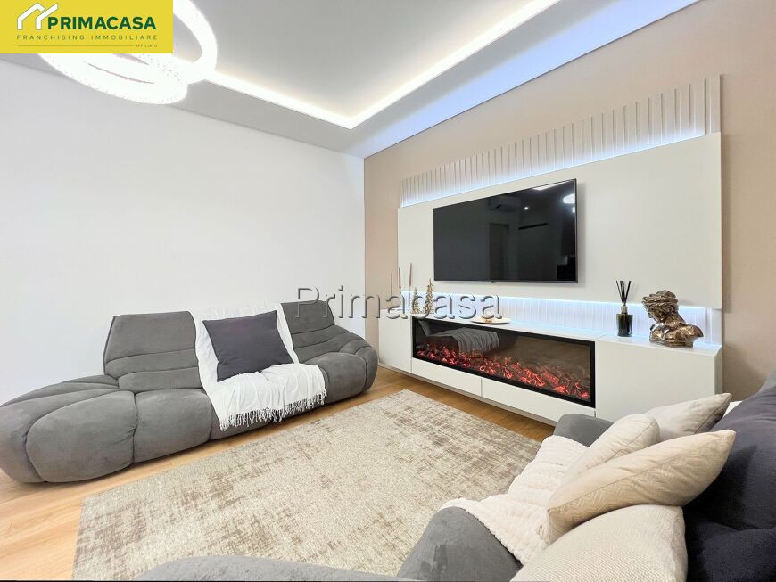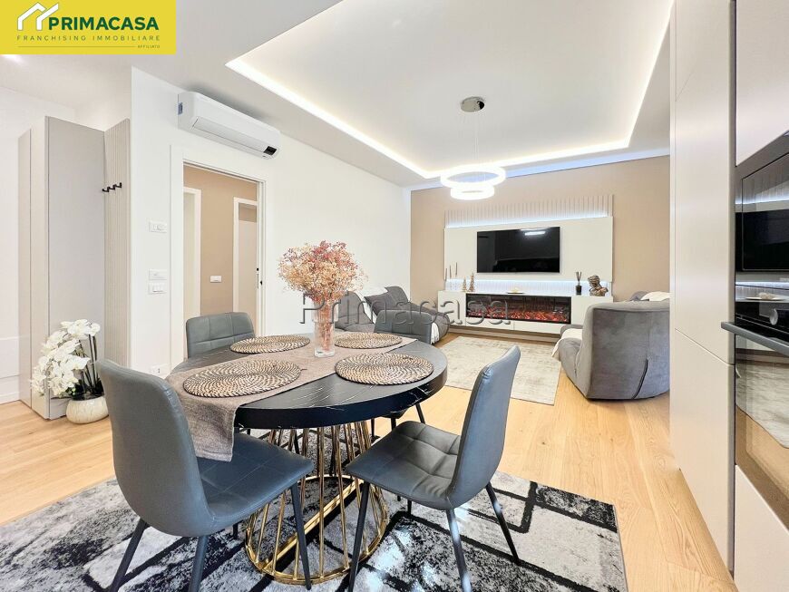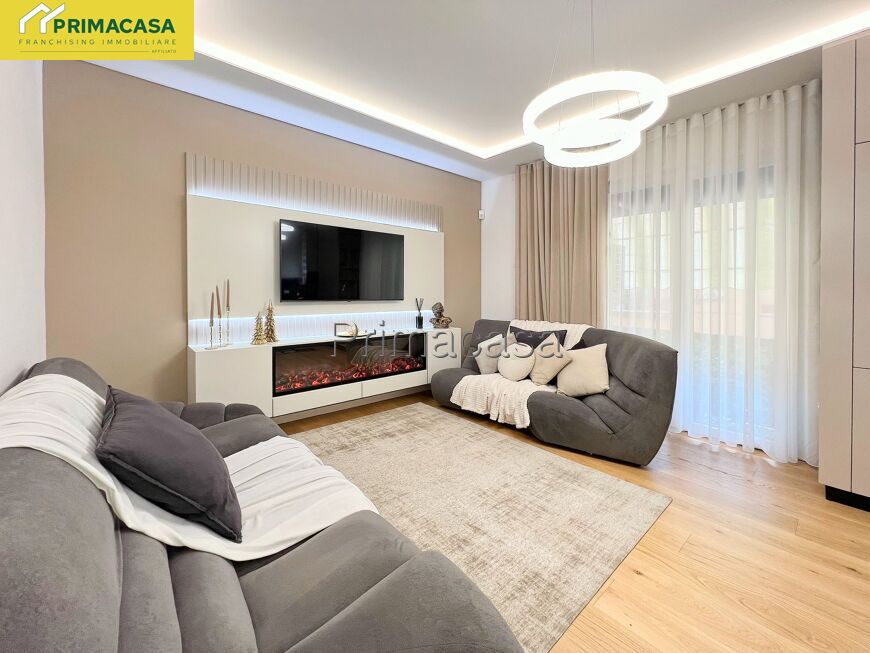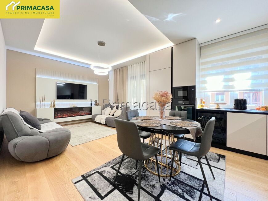 L’ingresso introduce a una luminosa zona giorno open space con angolo cottura, impreziosita da cucina su misura completa di cantinetta vini e parete TV con suggestivo caminetto decorativo, ideale per creare un’atmosfera accogliente. Dal soggiorno si accede a un comodo terrazzino dotato di tenda manuale.