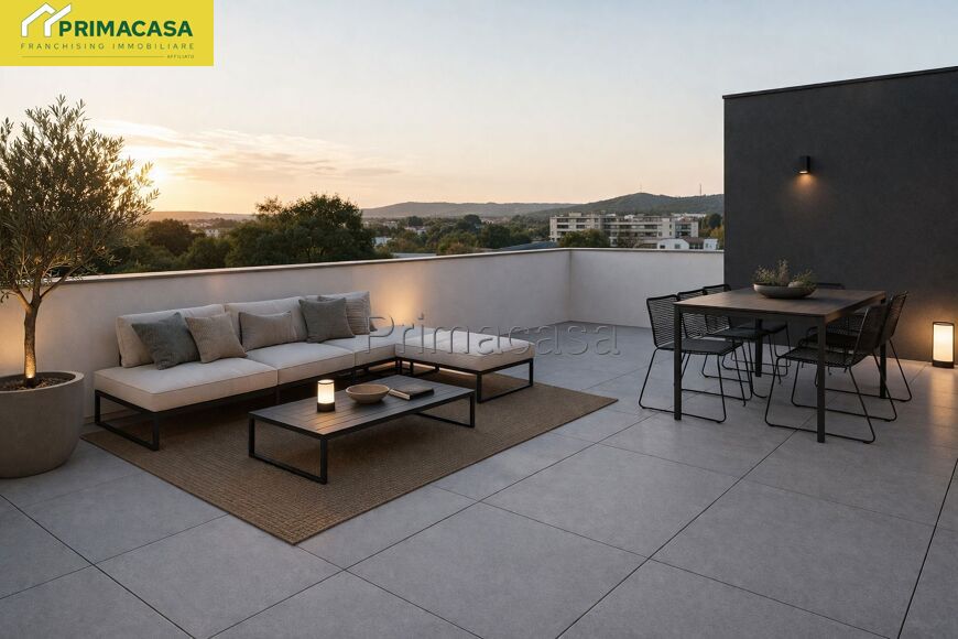 A valorizzare ulteriormente la soluzione troviamo un’ampia terrazza abitabile di 25 mq, ideale per momenti di relax all’aperto e convivialità, oltre ad una cantina di 25 mq, uno spazio raro e versatile perfetto come deposito o area hobby, e un comodo posto auto di proprietà.